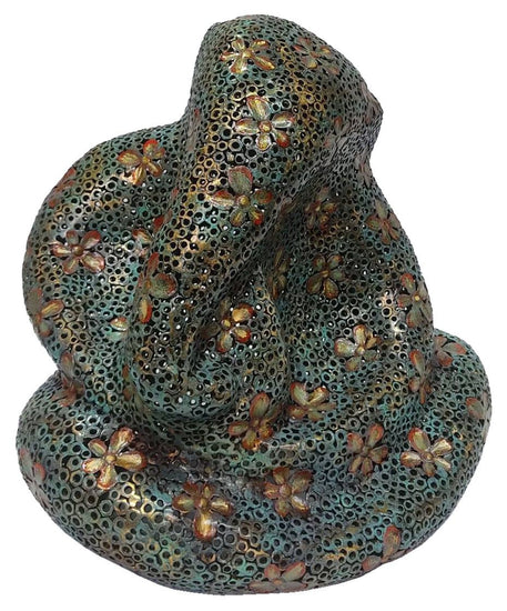 Saha primarily works with bronze, brass, and copper. He also uses other materials like fiberglass and is skilled in painting and printmaking. His art incorporates elements of Indian culture, such as the ghungaroo (traditional dance bells), nature motifs, and the figure of Shiva. The bull is a prominent metaphor in Saha's sculpture, used to represent themes beyond its common association with strength. It symbolizes a blissful visual experience and reflects its deep significance in Indian mythology as the divine vehicle of Shiva.