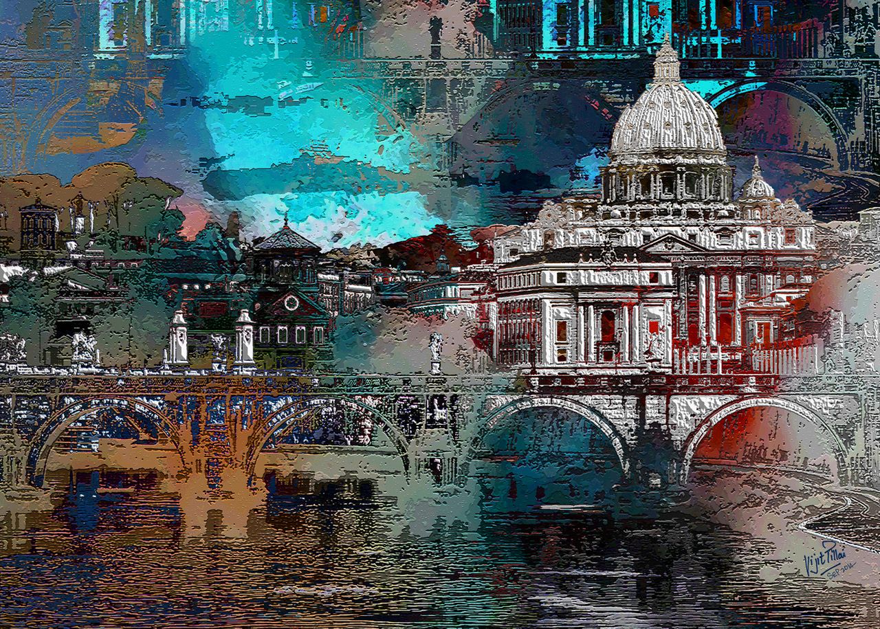 An interpretation of St. Peter's Basilica in Italy through the lens of Vijit Pillai. The artist uses his own photographs which take new form through the use of textures, filters, patterns and sophisticated techniques.