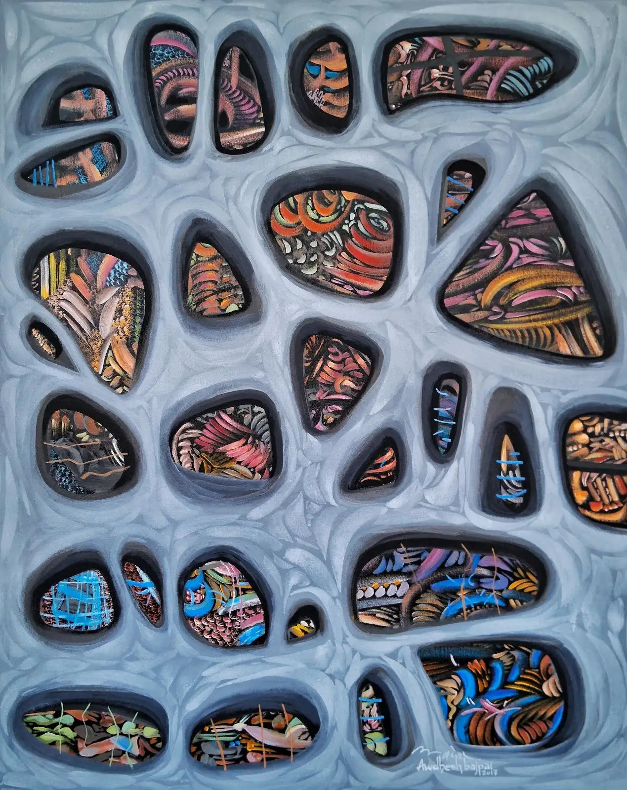 Awdhesh Bajpai's paintings, which transfigure into ever-changing forms, invite viewers to engage with the mysteries of the universe. His works emphasise his deep interest in how life was created millions of years ago and therefore carry traces of Science, History, Poetry and Language. There is no center of focus in the painting, wherever you look becomes the focus. Bajpai’s artistic journey began in his hometown, Jabalpur, Madhya Pradesh, with using everyday tools and natural found materials like clay, charcoal, trees, and leaves. He has also spent time in distinguished cultural hubs like Shantiniketan, and Bharat Bhawan in Bhopal where he continued to experiment with sculptures, pottery, and murals after graduating in fine art from Kalaniketan in 1989.Today, he continues to draw inspiration from literature, news media, mythology, philosophy, art history, and popular culture which he integrates into his exploration of contemporary crises